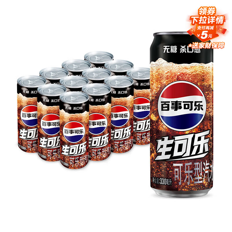 百事可乐Pepsi 无糖生可乐 碳酸饮料汽水 330ml*12听 细长罐整箱装
