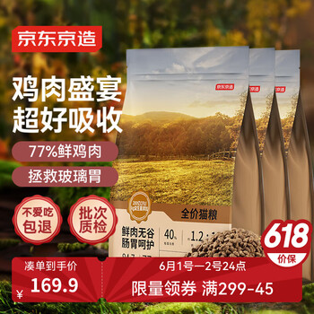 京东京造 鲜肉无谷肠胃调理猫粮(鸡肉盛宴)6kg 低敏鲜鸡肉蛋白酶解2kg*3