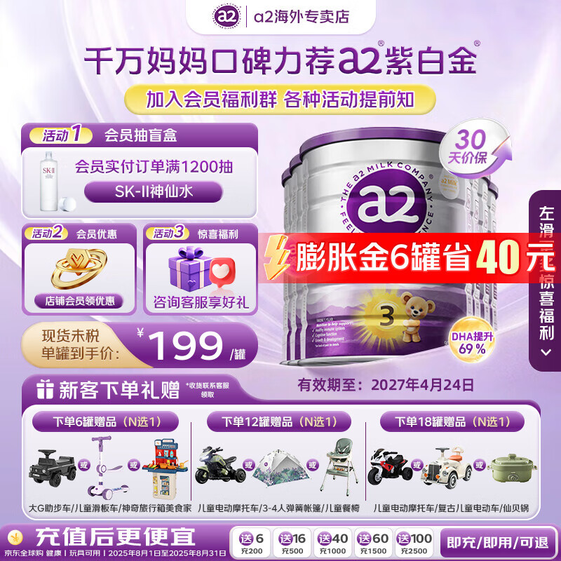 a2奶粉 澳洲紫白金版婴幼儿配方奶粉 含天然a2蛋白 新西兰原装 【首购送礼品】3段6罐900g