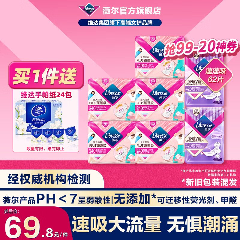 薇尔【优于新国标】量大防漏PLUS蓬蓬吸卫生巾姨妈巾护垫日用夜用套装 日夜组合62片(240+420)