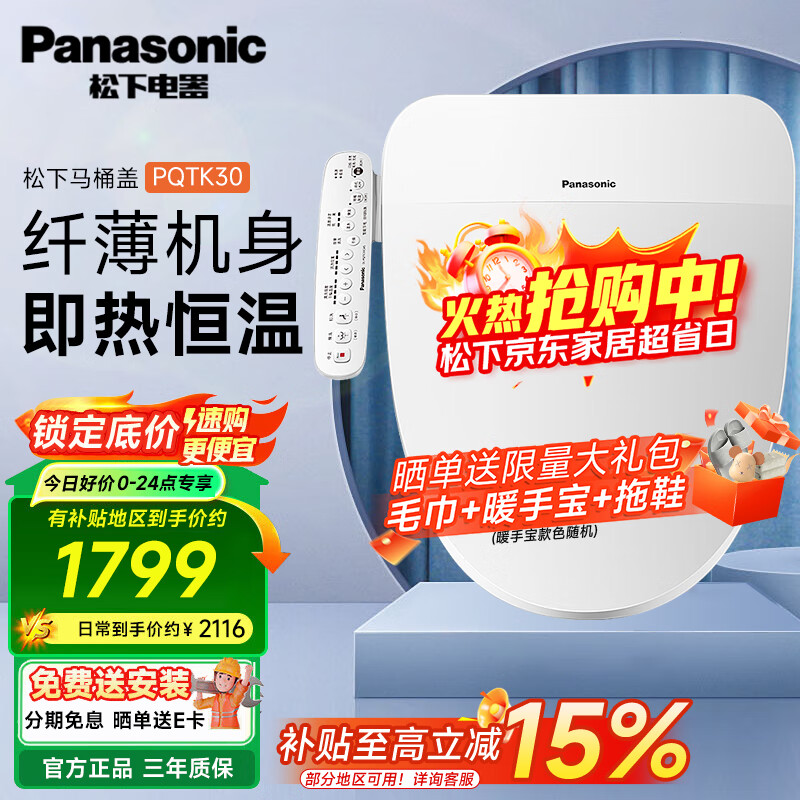 松下智能马桶盖PQTK30家用加热电动冲水马桶圈坐便盖 暖风烘干除臭款