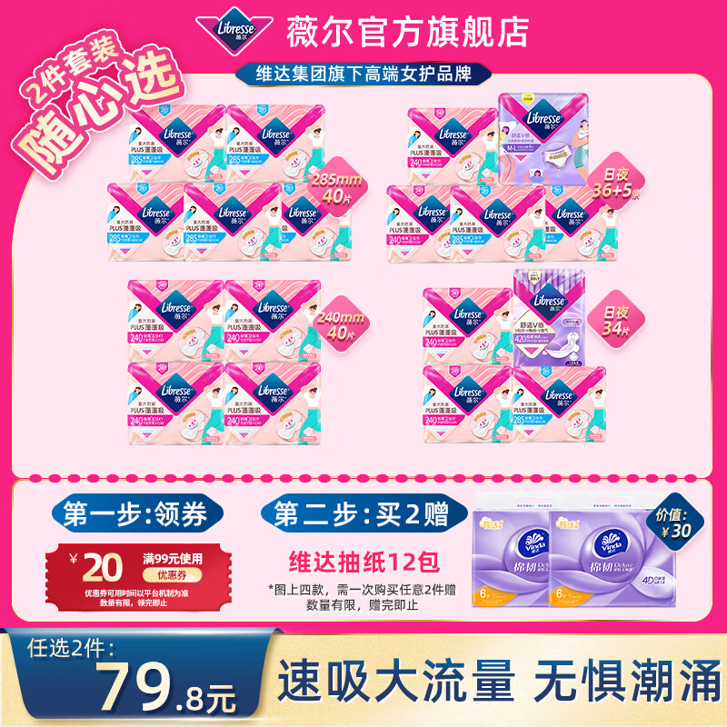 薇尔量大防漏【优于新国标】PLUS蓬蓬吸卫生巾姨妈巾加长日用夜用超薄 日夜组合34片