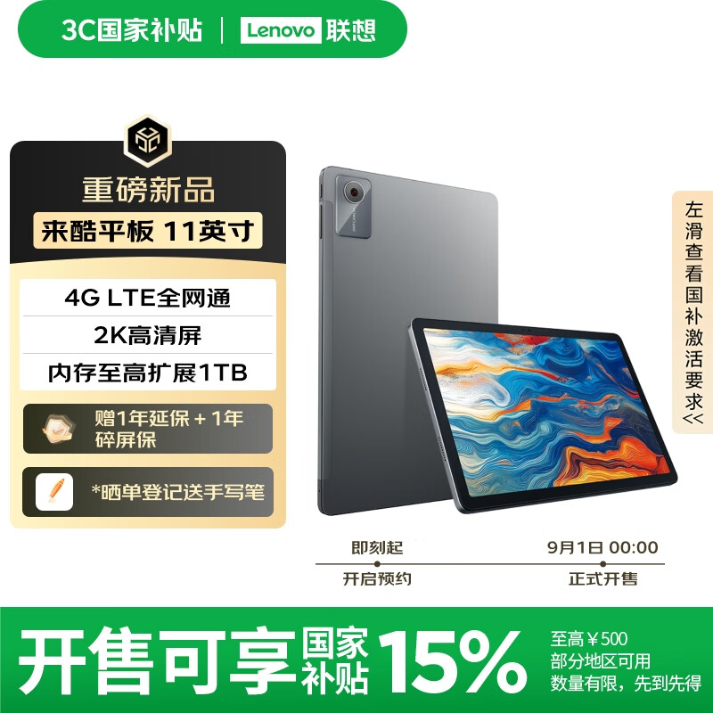 联想(Lenovo)来酷平板11英寸 2K超清屏 硬件级防蓝光 多重护眼模式 4G全网通 超长续航 北斗+GPS 8+256G