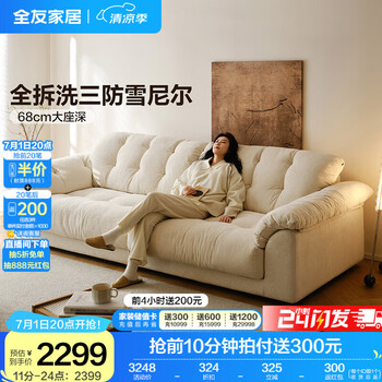 全友家居云浪沙发可拆洗布艺沙发客厅小户型家用三人位直排沙发家具 50%选择【京仓闪发】2.7m云絮白 三防面料|全拆洗+乳胶+68cm坐深