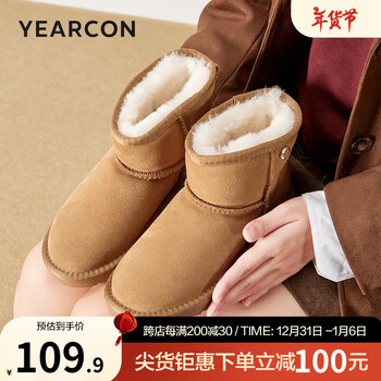 意尔康女鞋雪地靴女士2024冬新款厚底加绒加厚保暖羊毛棉鞋百搭中筒短靴 土黄色 靴筒羊毛内里 37