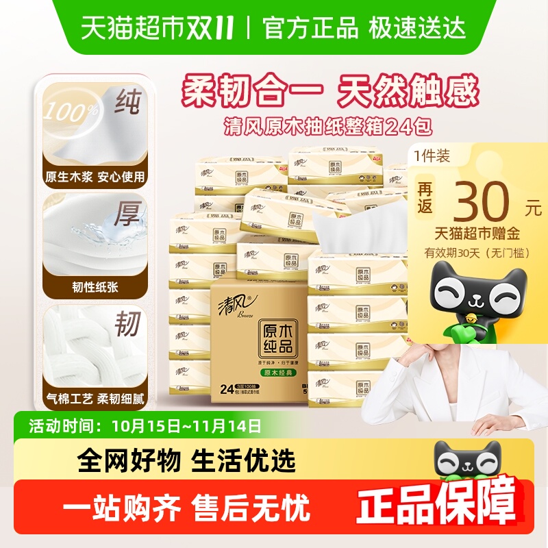 【下拉详情享优惠】清风抽纸原木/就你3层面巾纸餐巾纸卫纸巾整箱