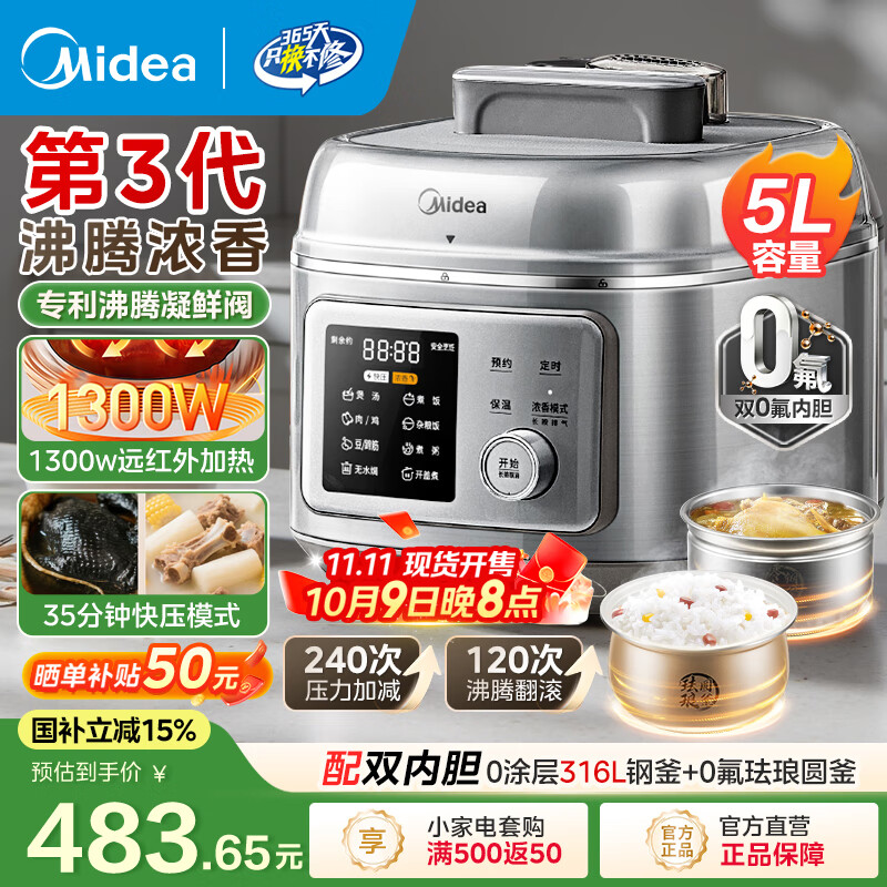 美的(Midea)5升电压力锅4-5人高压 2025新款电高压锅0涂层316L不锈钢内胆高压电饭锅高压锅家用3-4个人煲汤锅 【第3代沸腾浓香】浓香&快压双模式 5L