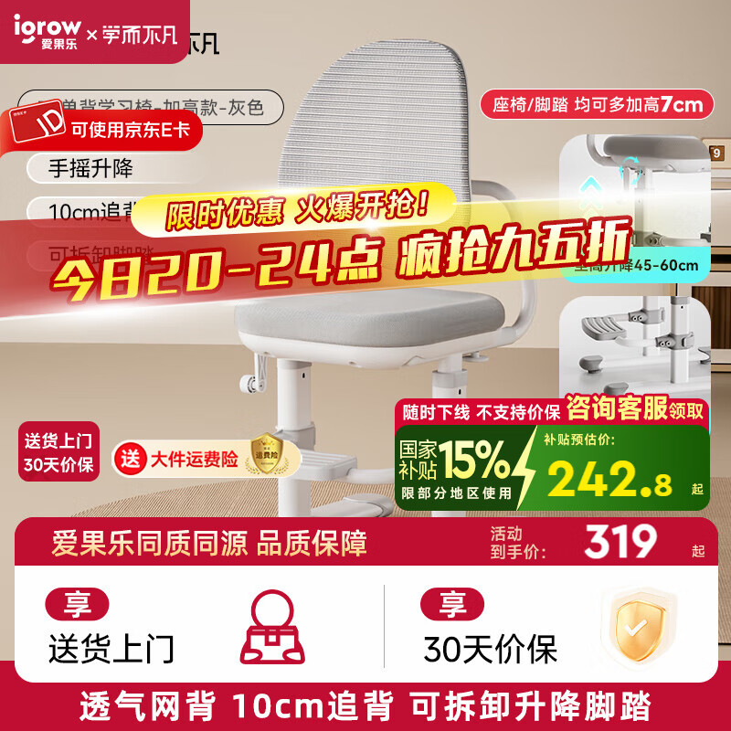 爱果乐学而不凡儿童学习椅子可升降儿童座椅写字椅学生学习椅网背椅B5 单背加高款-灰