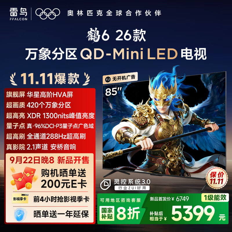 TCL雷鸟电视鹤6 26款 85英寸 万象分区QD-MiniLED1300nits 高阶HVA安桥音响288Hz平板电视机85R69A-A