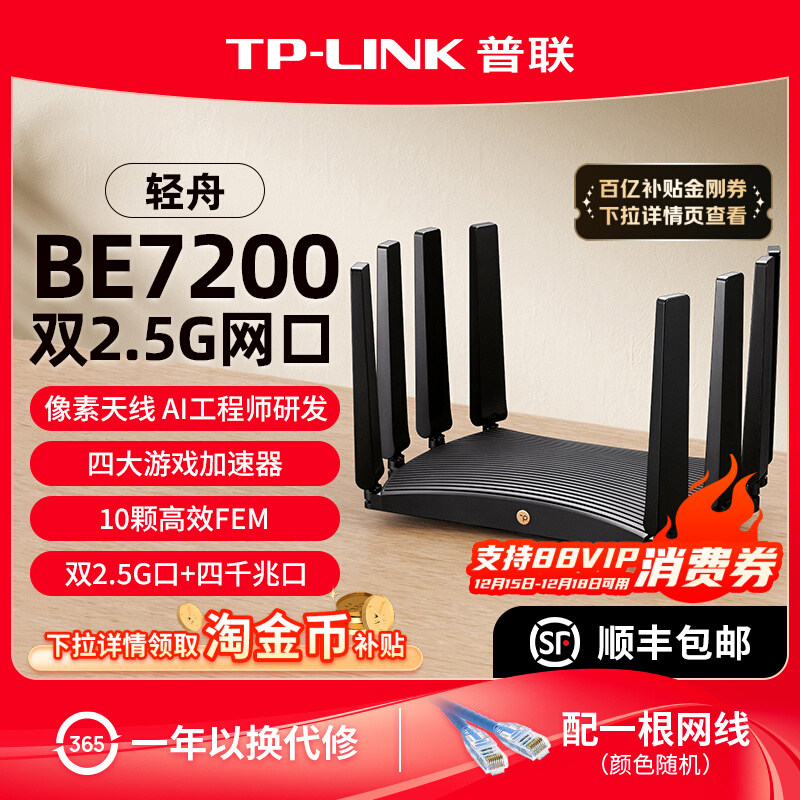 普联TP-LINK 轻舟WiFi7 BE7200路由器 双2.5G口千兆家用高速tplink无线mesh全屋覆盖大户型穿墙7DR7270