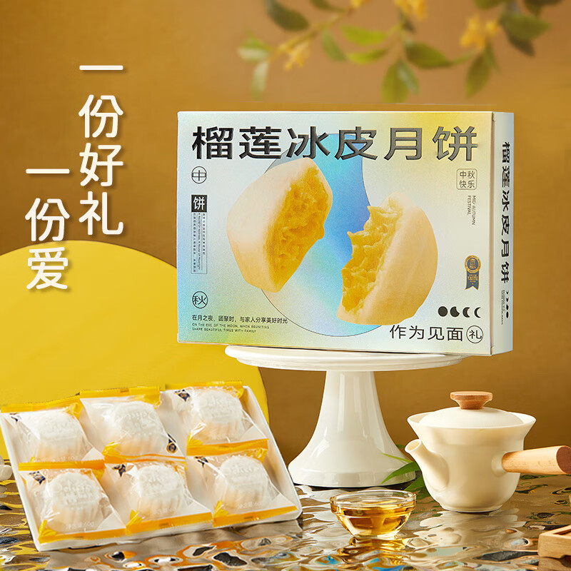 熊治猫山王榴莲冰皮月饼流心冰淇淋爆浆口感纯果肉高档中秋礼盒 榴莲冰皮月饼*6枚
