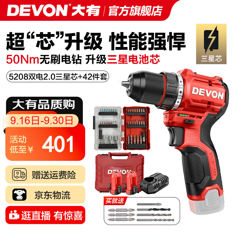 大有(Devon)12V锂电无刷电钻5208手电钻冲击钻5209电动螺丝刀起子机50牛米 5208 2.0Ah双电快充三星芯+42件套