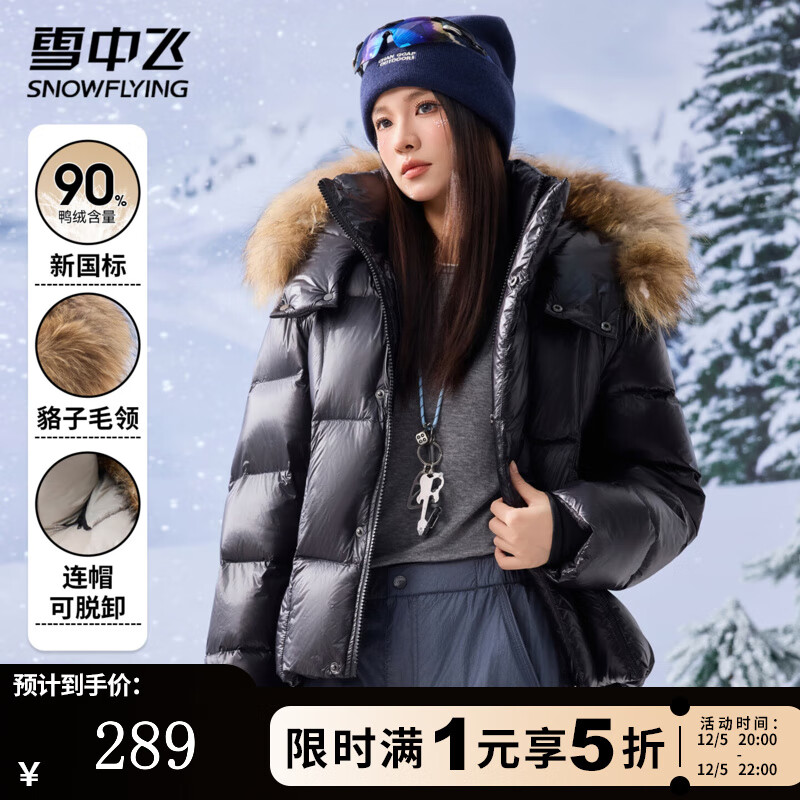 雪中飞羽绒服女士工装短款保暖潮流纯色防寒羽绒衣貉子毛领亮面情侣外套 黑色 S (165)