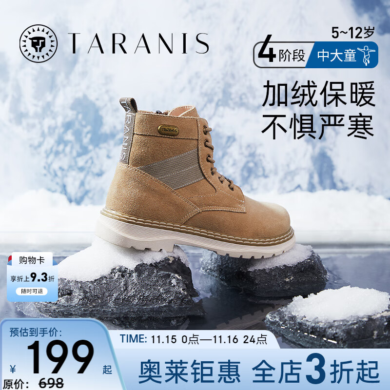 泰兰尼斯男女童靴子秋冬季新款儿童马丁靴防滑软底中大童短靴 驼色(冬季加绒选大一码) M04D2D2251 34 内长22.0/适合脚长21.0