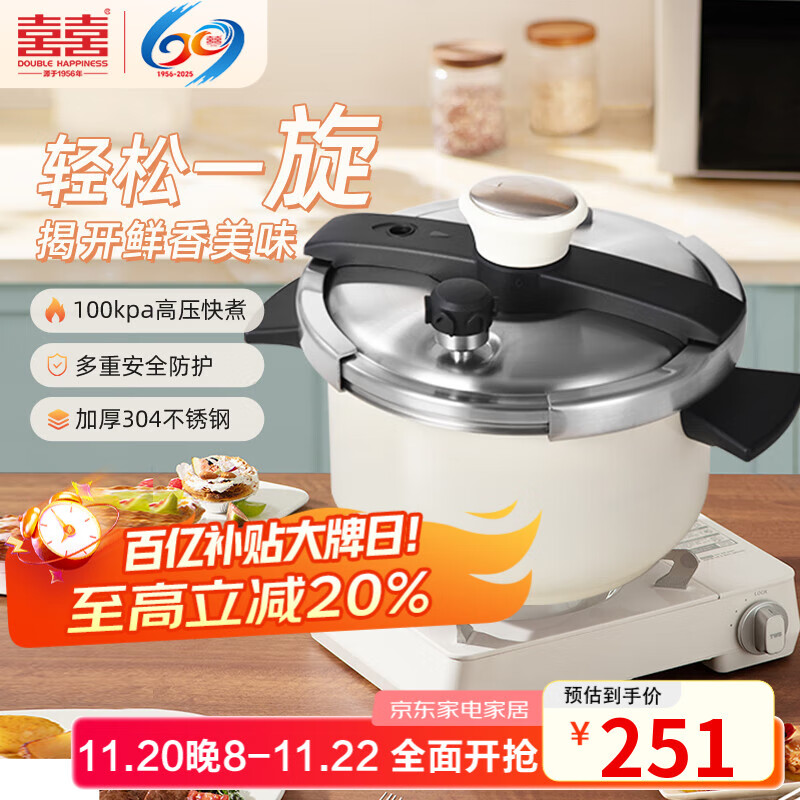 双喜高压锅304不锈钢燃气电磁炉通用防爆压力锅单手开合22cm/6L珍珠白
