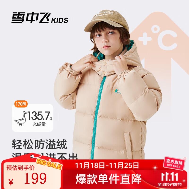 雪中飞童装儿童羽绒服男童冬季新款女童中大童装面包羽绒服 米卡其 170