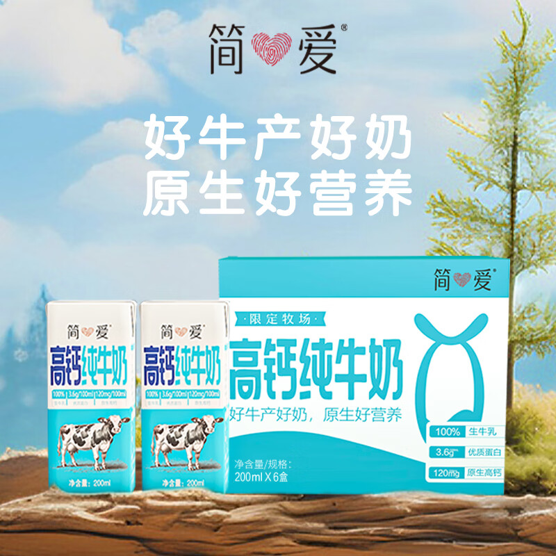 简爱高钙纯牛奶限定牧场3.6g优质乳蛋白常温整箱全脂牛奶200ml*6盒