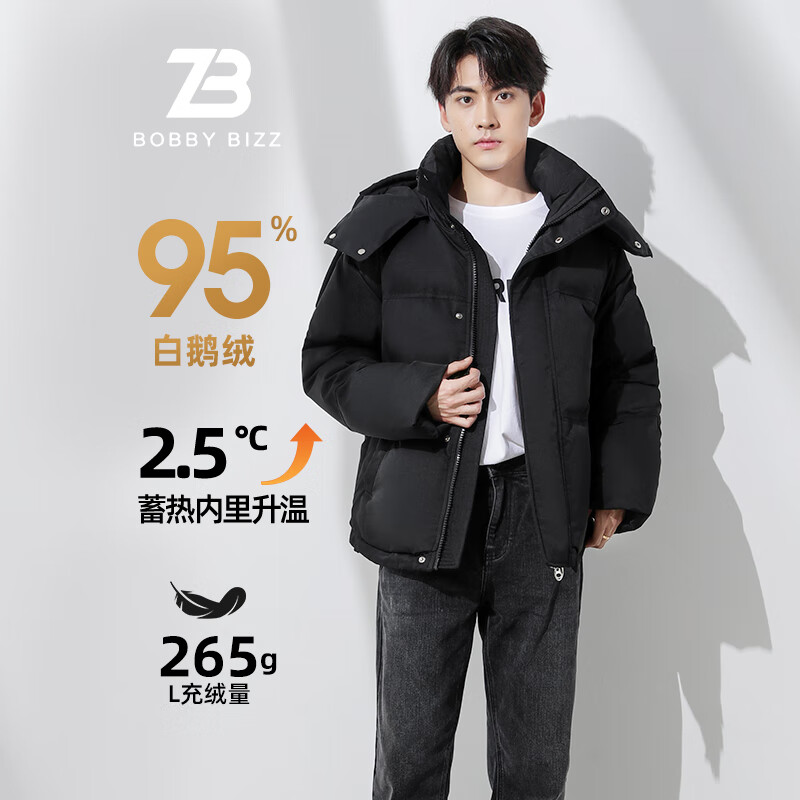 BOBBY BIZZ羽绒服男款2024冬季新品短款时尚百搭上衣95%白鹅绒加厚保暖外套 黑色 L 180斤左右
