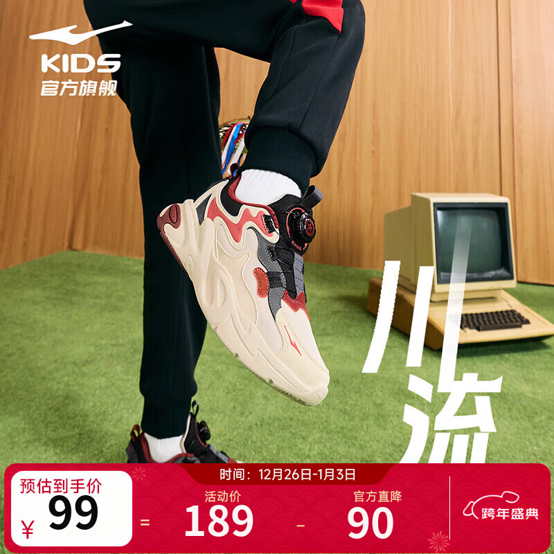 鸿星尔克儿童运动鞋男女童秋冬网革帮面魔旋纽扣休闲跑步老爹鞋|川流2 暖亚麻/正黑 -偏小1码 37