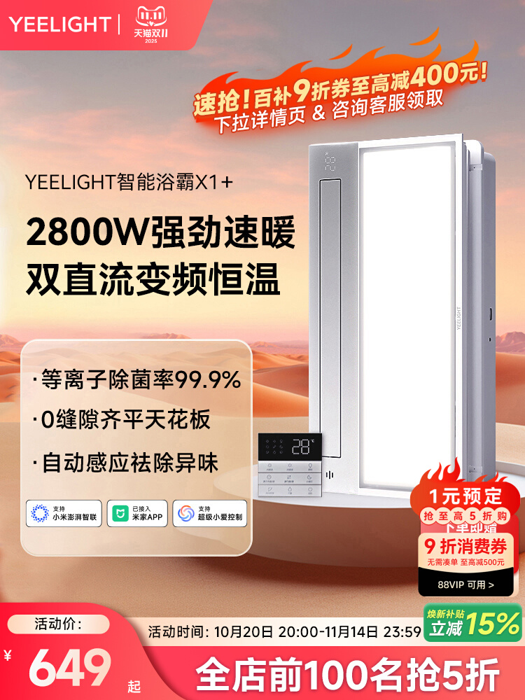 Yeelight智能浴霸集成吊顶照明排气扇一体卫生间易来多功能暖风机