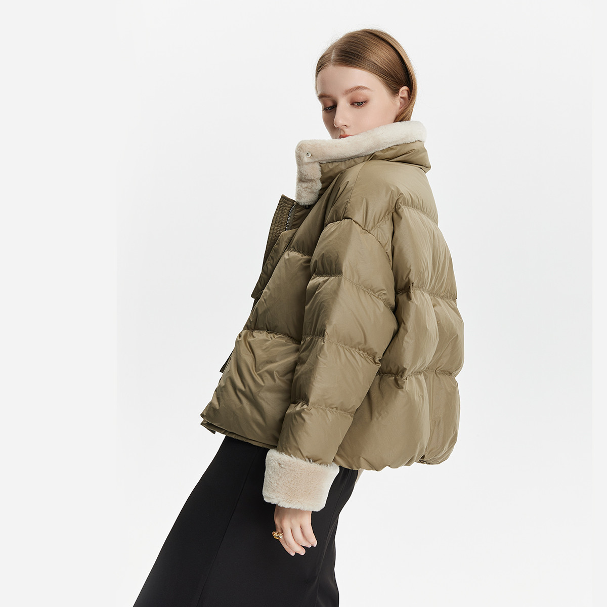 【美式复古】拼接设计舒适鸭绒女式立领直筒短款羽绒服