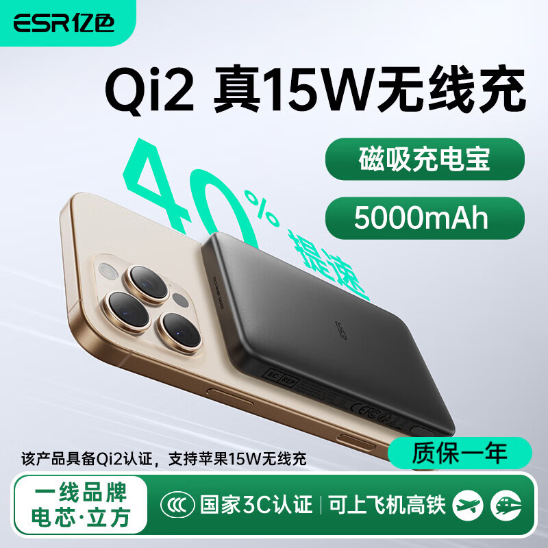亿色【苹果15W丨3C认证】Qi2磁吸充电宝MagSafe15W无线快充10000/5000毫安可上飞机移动电源适用苹果17 魔力黑丨5千毫安【3C认证】 Qi2认证丨真15W无线快充