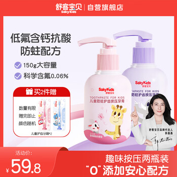 舒客宝贝舒克儿童牙膏按压式150g大容量含氟防蛀2-12岁葡萄味+草莓味2瓶装