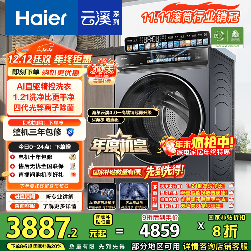 海尔(Haier)年度机皇 云溪4.0高配版 滚筒洗衣机全自动家用 超薄家电国家补贴 10KG京东自营G583 73K相似款