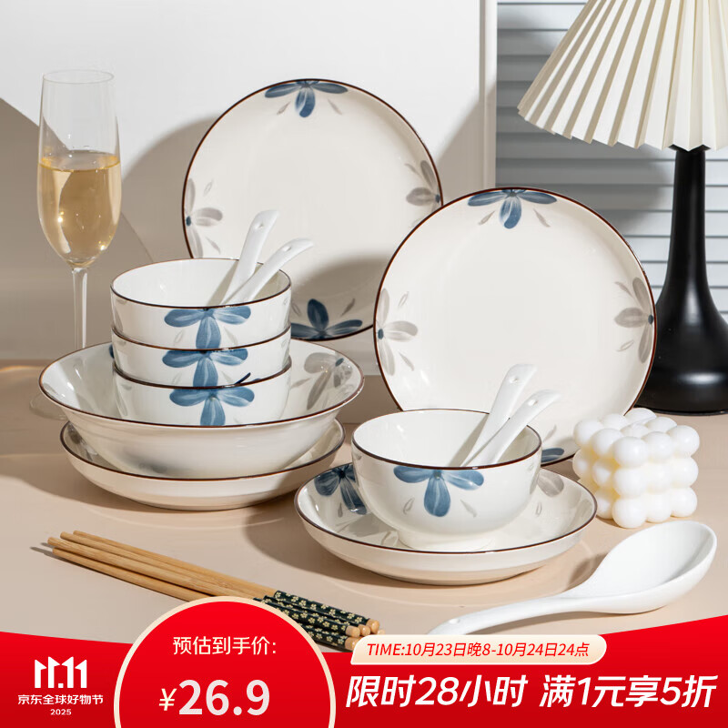 康琴(KANGQIN)墨兰北欧餐具整套网红新款碗碟套装家用高颜值碗盘组合乔迁餐具 墨兰四人食配汤碗 18件套