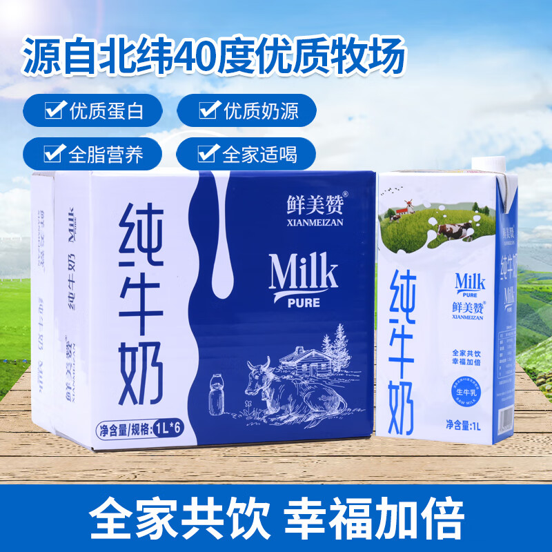 鲜美赞全脂纯牛奶1L*6盒/箱 家庭装 早餐奶