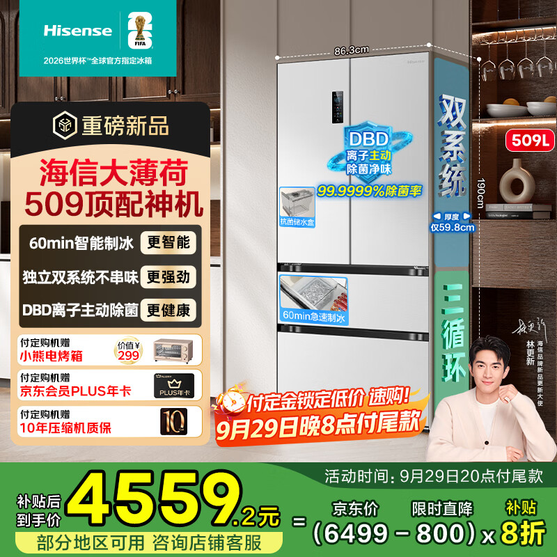 海信大薄荷509冰箱超薄零嵌入式四开门法式多门双系统自动制冰风冷主动除菌BCD-509S3FZSQD白