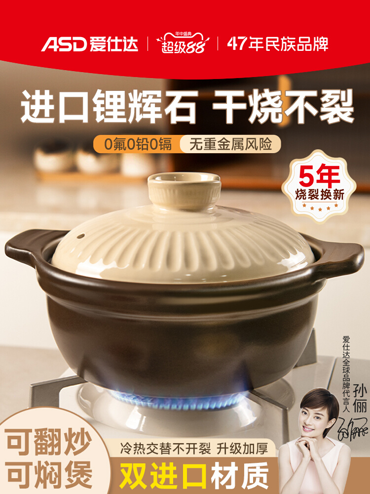 爱仕达砂锅煲家用陶瓷煲耐高温干烧不裂家用明火燃气灶煲仔饭汤锅