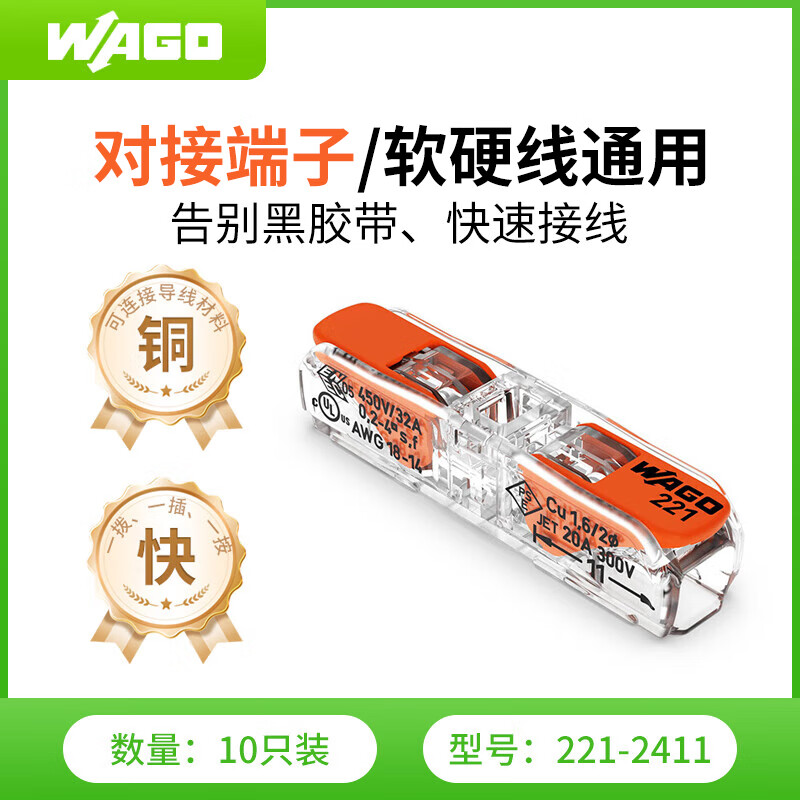 自营WAGO万可接线端子 灯具电线接头10只装 软硬线适用221-2411