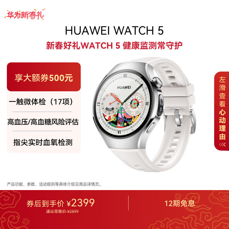 自营华为【送礼送健康】HUAWEI WATCH 5 42mm基础款不锈钢表壳金星白素皮复合表带X-TAP智感窗eSIM通信手表