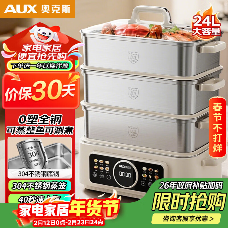 自营奥克斯(AUX)全钢电蒸锅23.5L大容量炖蒸煮一体电煮锅电火锅猛火多功能锅电热锅三层304全钢蒸笼ADZ-50AZX-107A