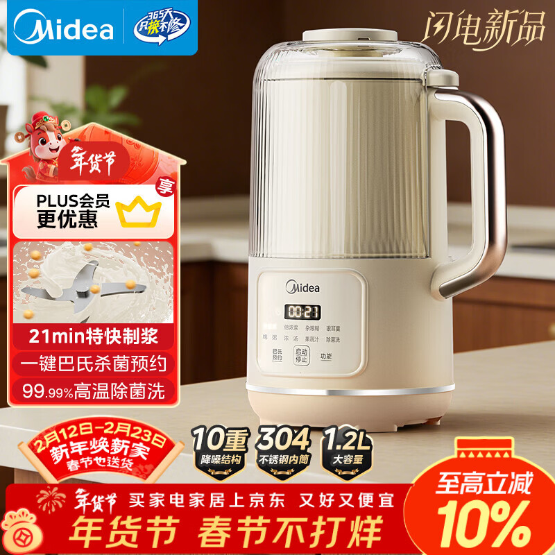 自营美的(Midea)豆浆机破壁机1.2L大容量4-5人轻音降噪 家用全自动一体免煮免洗新款 免滤防糊底榨汁料理机 YC23