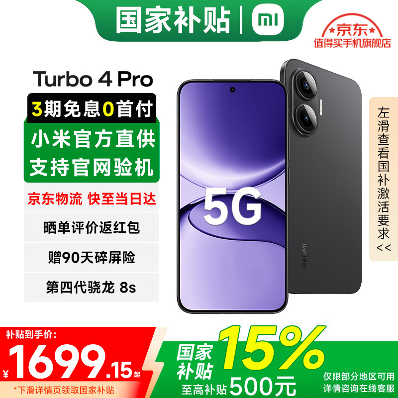 旗舰店小米红米Turbo4 Pro 国家补贴 第四代骁龙8s 7550mAh长续航 IP68防水 小米红米5G手机 黑色 12GB+256GB 【官方标配】