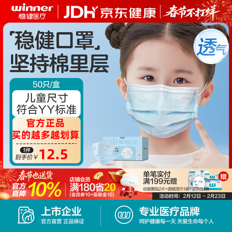 旗舰店稳健医用外科口罩一次性医用口罩成人儿童透气防过敏防飞沫防尘棉里层 1盒儿童款蓝色(贵在运费,4盒装更划算) 50只/盒