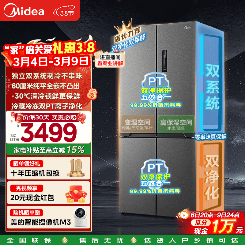 百亿补贴美的(Midea)M60真香系列508升十字对开四开门冰箱双系统双循环超薄零平嵌风冷无霜一级能效家用大容量政府补贴 BCD-508WUSPZM(E)星尘砂
