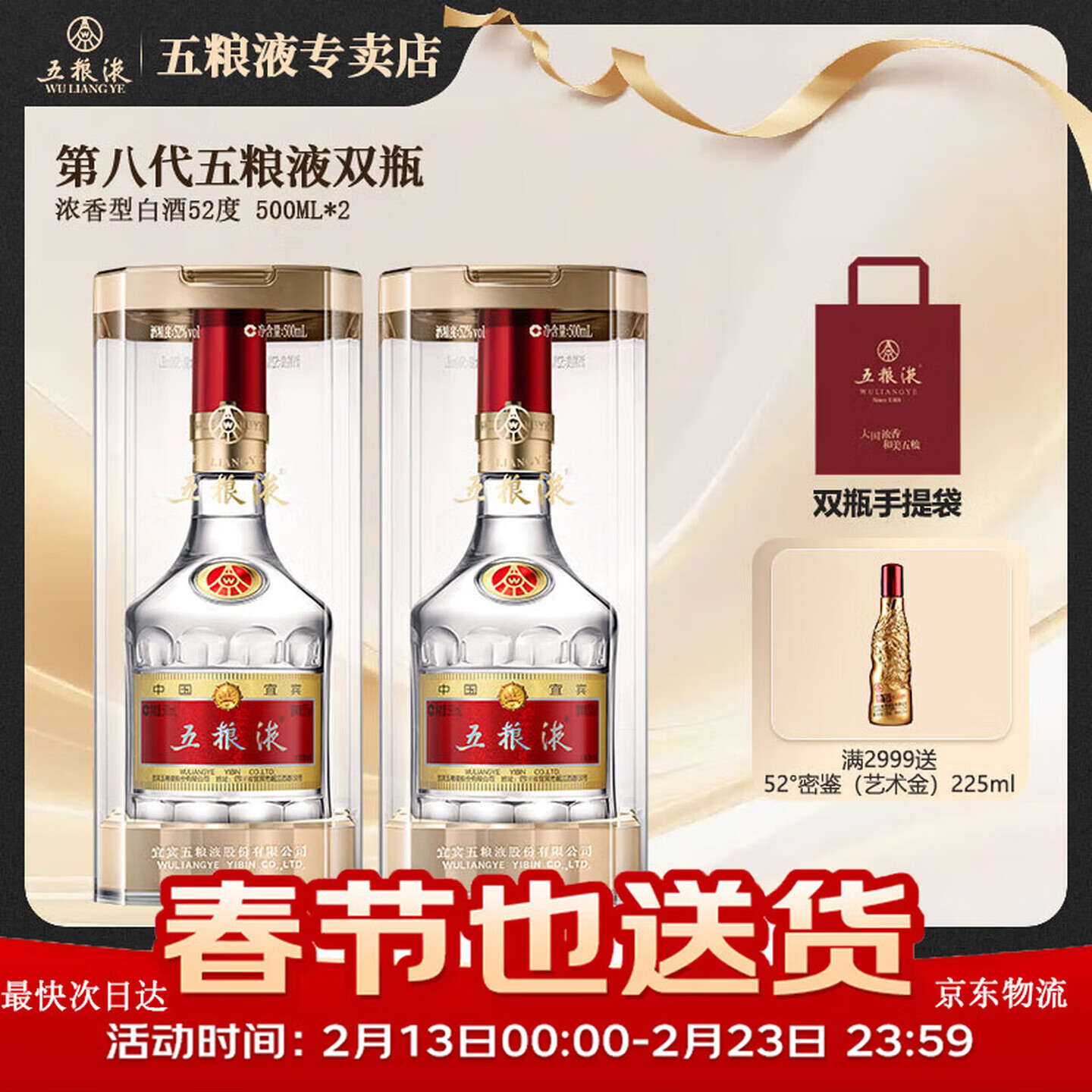 五粮液(WULIANGYE)普五八代 浓香型白酒 52度 500ml*2 双瓶 送礼袋 年份随机发货 52度 500mL 2瓶