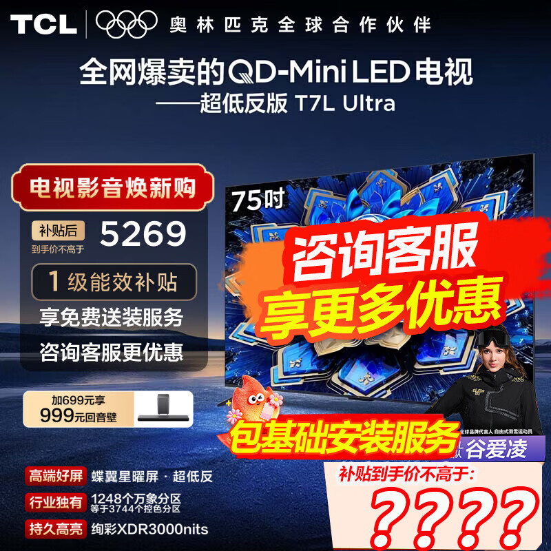 旗舰店TCL电视 75T7L Ultra 75英寸 QD-Mini LED 蝶翼星曜屏 万象分区 绚彩XDR 3000nits超薄电视机国家补贴 75英寸