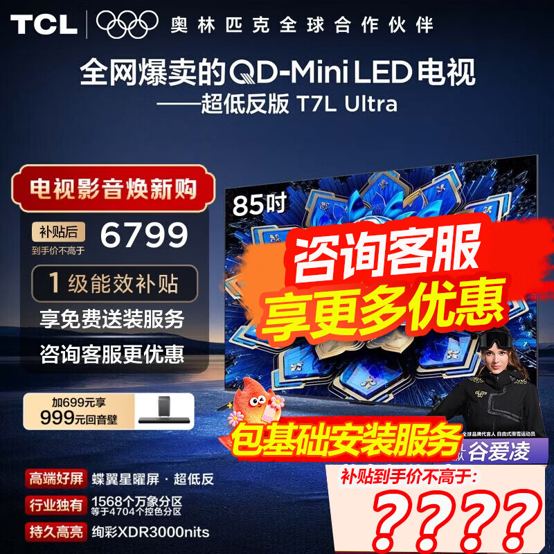 旗舰店TCL电视 85T7L Ultra 85英寸电视 QD-Mini LED 蝶翼星曜屏 万象分区 绚彩XDR 3000nits电视机国家补贴 85英寸
