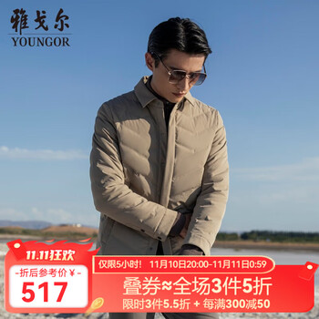 旗舰店雅戈尔(YOUNGOR)羽绒服男翻领短款羽绒服锦纶耐穿舒适透气男士上衣外套 VRYS439990YQA卡其色 180/100A