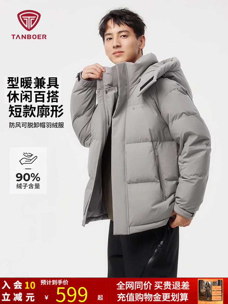 旗舰店坦博尔男士羽绒服冬季2025新款短款可脱卸帽休闲加厚防风保暖外套