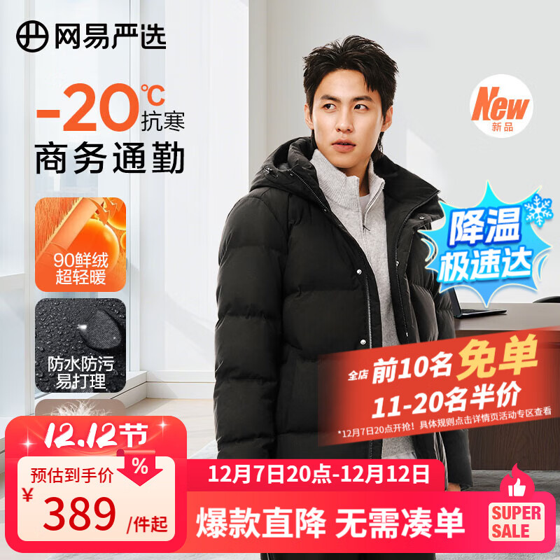 旗舰店网易严选新品90鲜绒轻商务面包服连帽羽绒服男通勤-20℃抗寒无氟防水防污 A款25秋冬-连帽-石墨黑 L (175/96A)