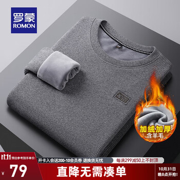 旗舰店罗蒙(ROMON)男士含羊毛纯色圆领卫衣新款中青年套头长袖T恤休闲打底衫上衣男 3W111307R浅灰 185