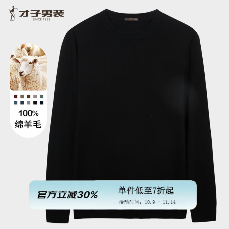 旗舰店才子(TRIES)【100%纯羊毛】男士毛衣男秋冬圆领修身毛衫轻柔保暖针织打底衫 黑色 XL 50 (175/92A)