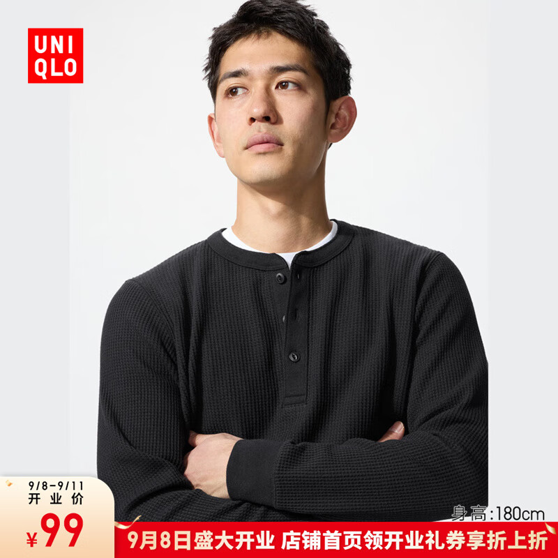 优衣库开业价男装/男女同款情侣华夫格亨利领套头衫长袖T恤纯色479784 09 黑色 L /175/100A