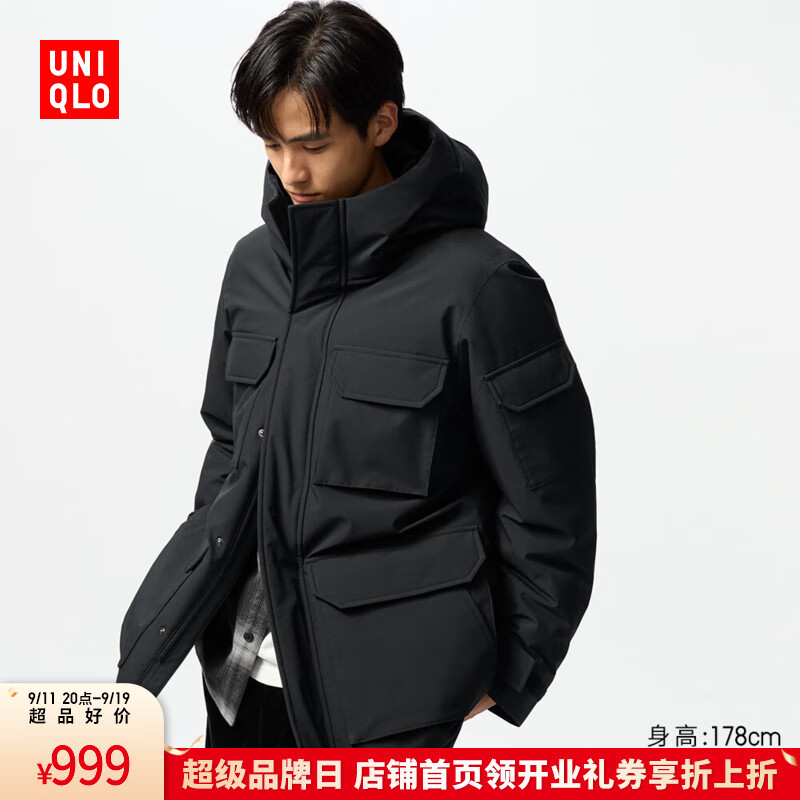 优衣库【超品好价】男装女装高级保暖羽绒茄克冰雪户外连帽外套477136 09 黑色 L /175/100A