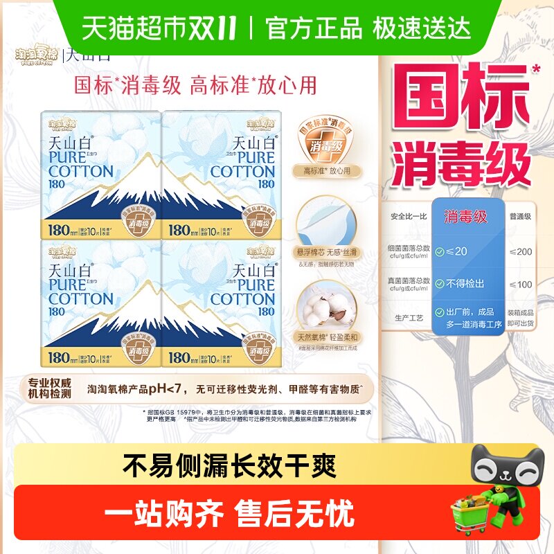 淘淘氧棉天山白纯棉卫生巾组合姨妈巾正品行李箱标准安全消毒级